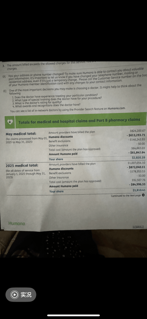 今天是主日,我去教會之前看到保險公司郵來的关於2025年1月至2025年5月份有關医療服務提供者的總費及付款明細